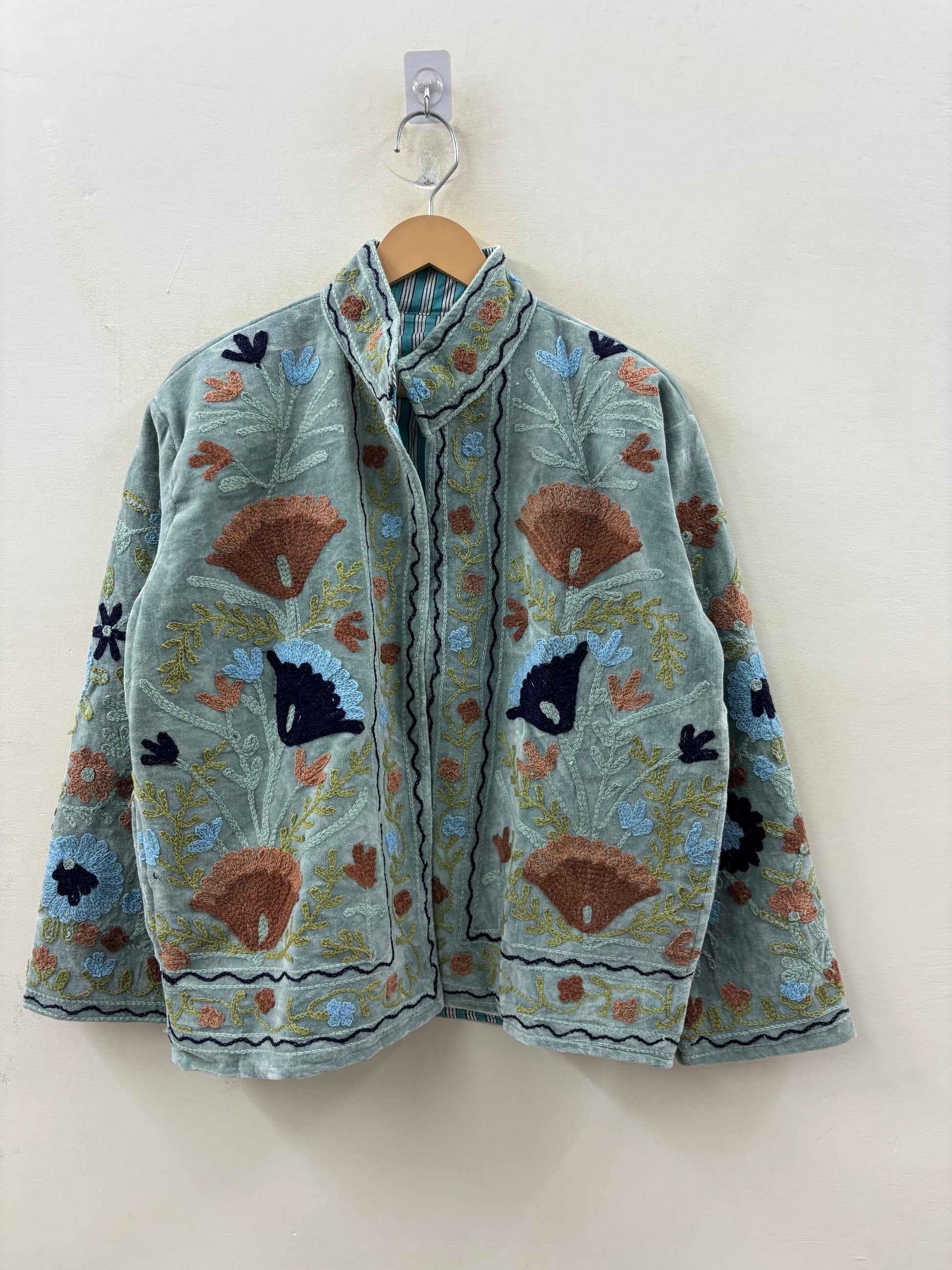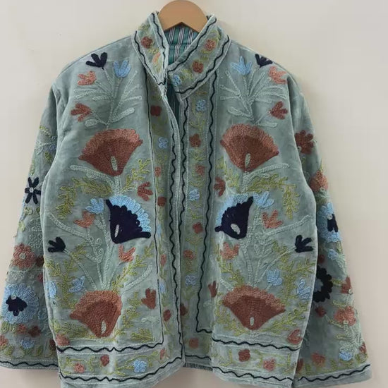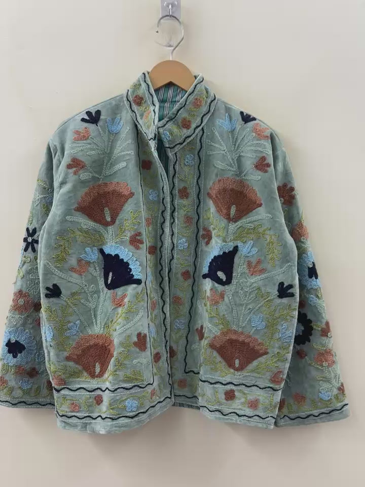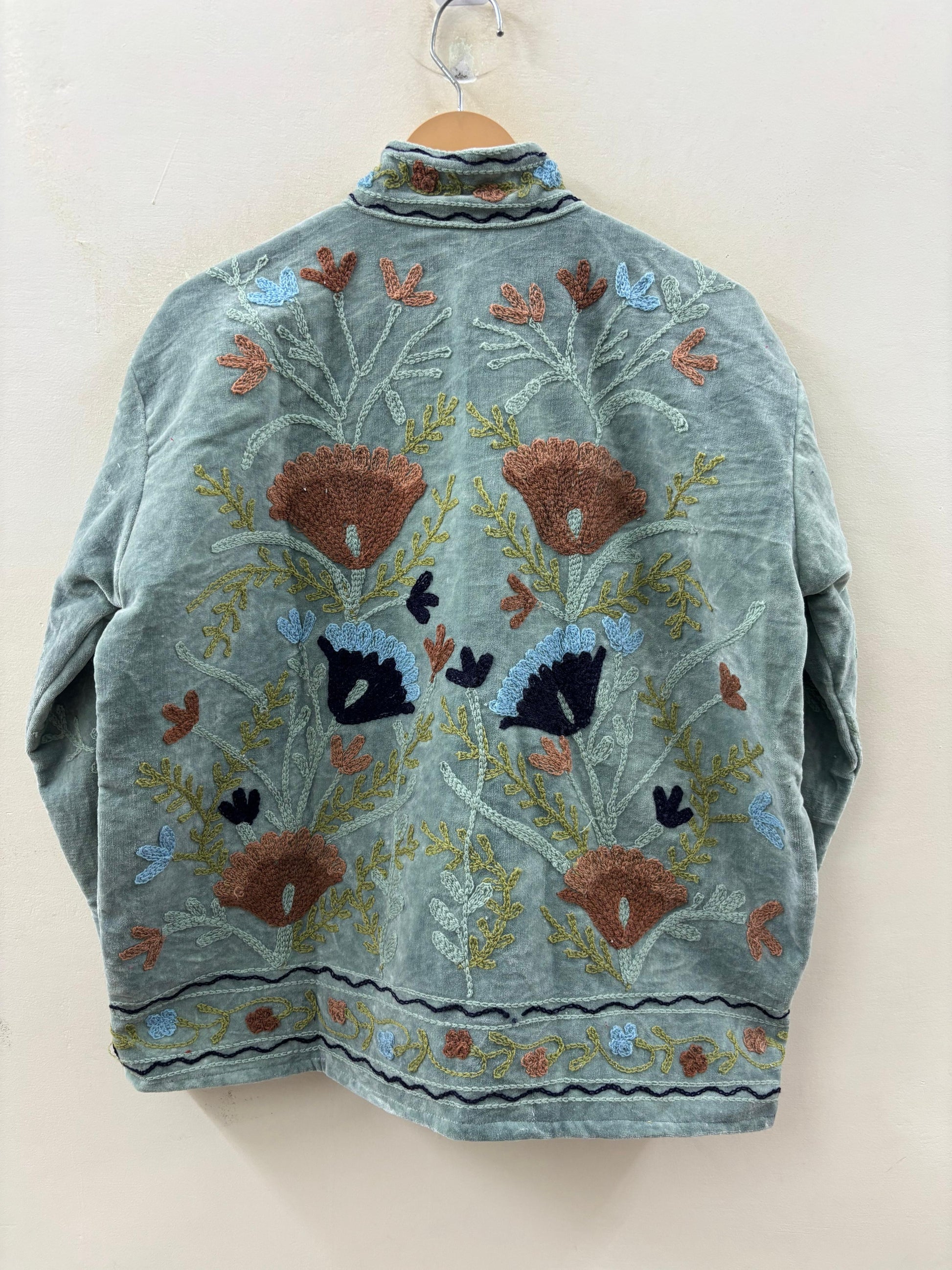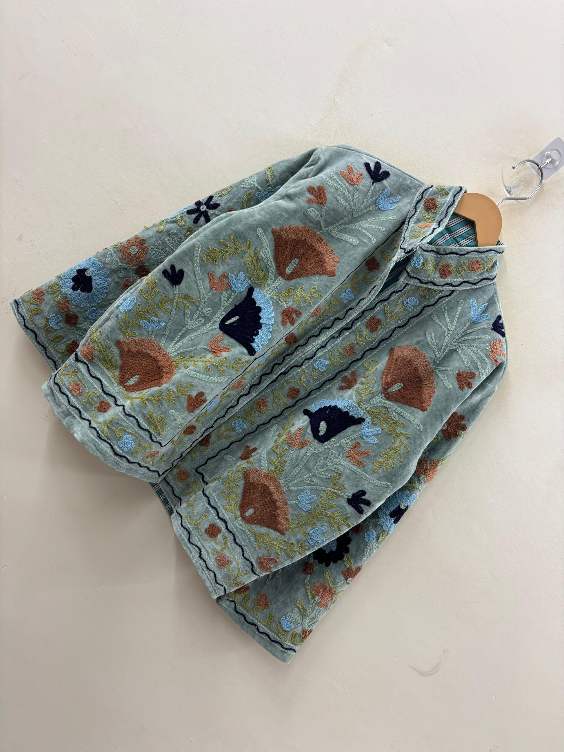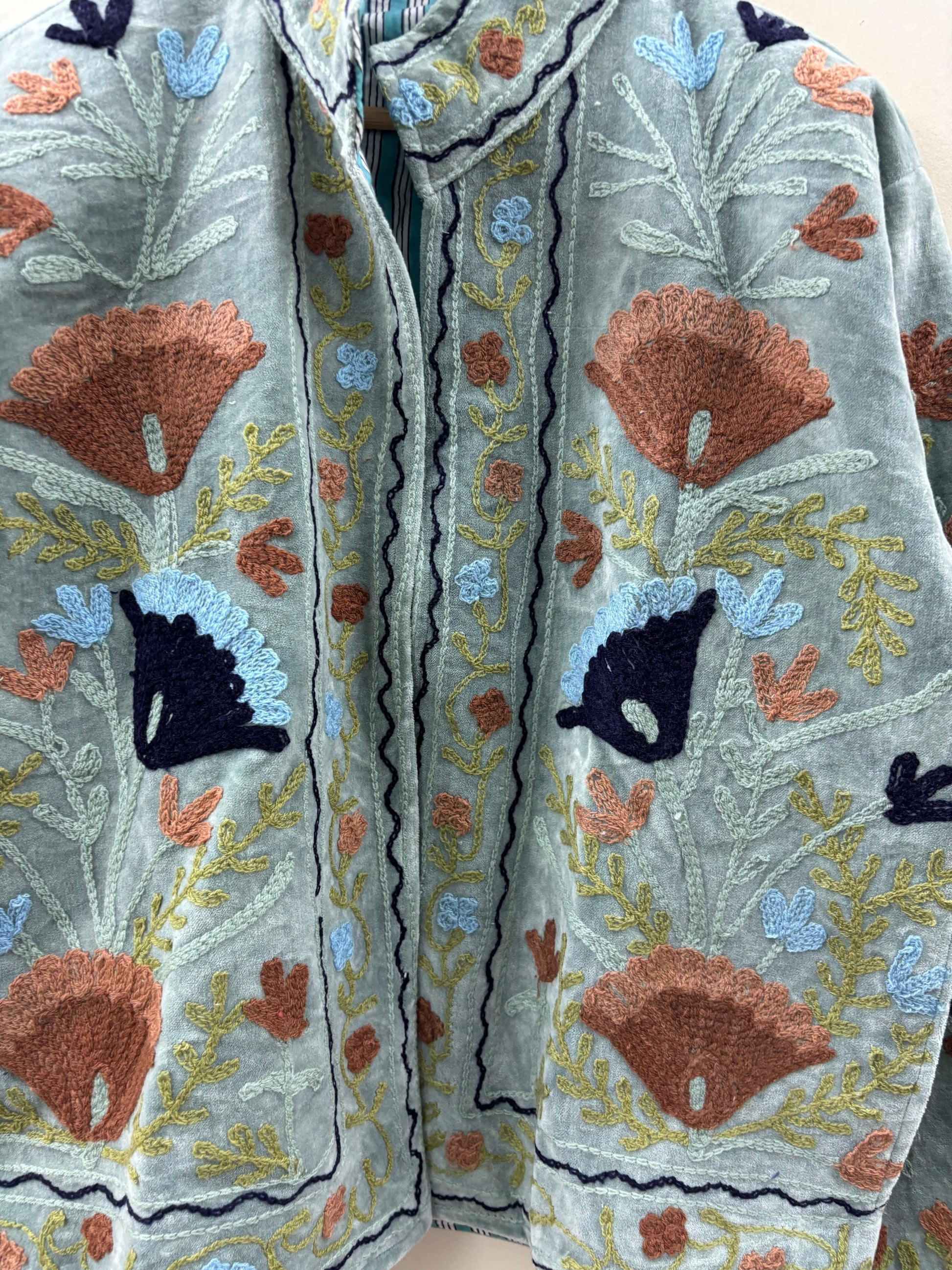 The Gulbadan Celadon — Hand Suzani Embroidered Velvet Jacket — Sage-Celadon Base